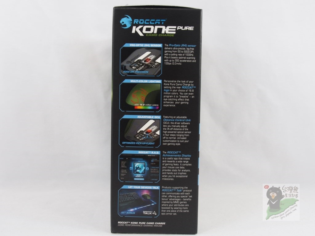 接下來就是開箱ROCCAT KONE PURE Camo Charge滑鼠跟大家來瞧瞧他的規格與吸引人的配色,事實上原以規格應該跟之前是相同的,沒想到ROCCAT不是改改顏色就推出,而是真的有做一些提升,所以熊說用心之處可以給讚來鼓勵,真的值得支持!