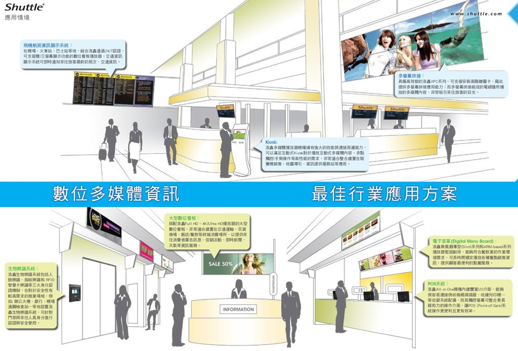 大數據Big Data的另一個意涵就是資料的輸入(產生)與呈現的量體也跟著增加,所以除了著重資料的儲存之外(NAS),資料的處理能量、輸入、輸出也都相對的需要培套。所以因應階段資料處理能力的伺服器、資料輸入的數位選單工作站(含POS)、即時數位顯示的大型數位看板與互動式資訊看板,這些不同應用性質的工作,也就成了Shuttle這一陣子另外發展的重點。包含生化辨識系統、監控系統…,適型化的應用電腦於焉產生,看的到浩鑫積極地想要走屬於自己的藍海。