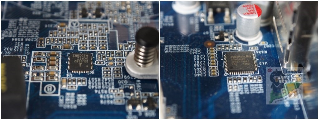 另一側 80 PLUS的300W POWER,ISL9582、ASM1442、除了音效電容外其他都是採用固態電容,板上也處處看到亞鐵芯電感。