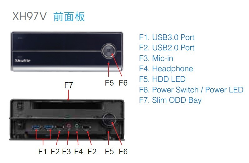前方下半部是前置I/O介面,右側邊雙風扇幫忙散熱,所以Shuttle XH97V較適合橫躺使用!