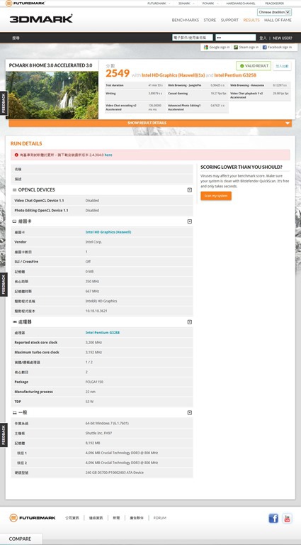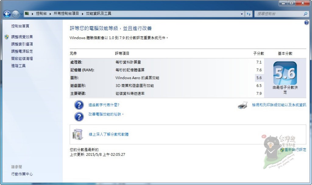 先測一下Windows 7效能體驗指數: 7.1 / 7.6 / 5.6 / 6.5 / 7.9,所以整體成績與大台的桌上型電腦是相同的,合於水準,一般都認為超薄型的電腦效能會較低,但由XH97V搭配G3258與Crucial 記憶體、CJS 240GB SSD來看,成績是OK的!