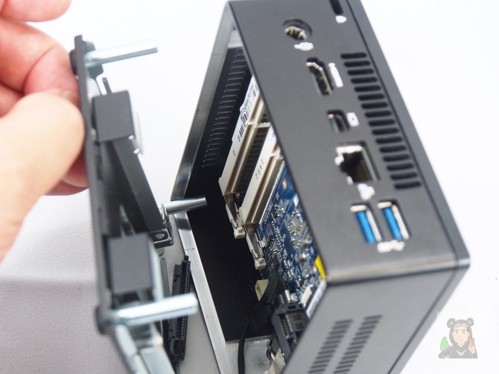 GB-BXi3H-5010是採用4根長螺絲釘固定,旋開之後捏住底部的一個小圓把手就可以拉開了!