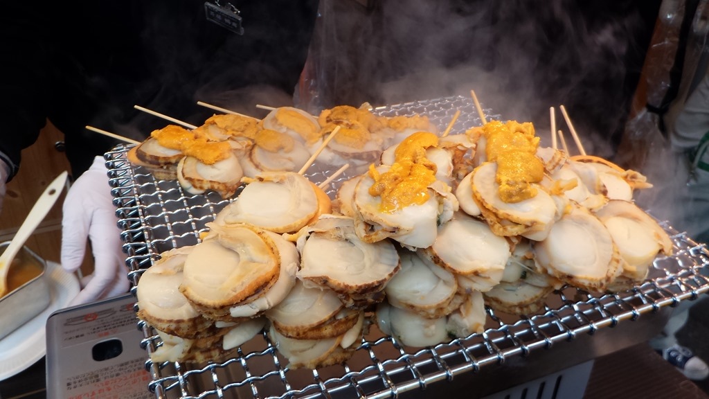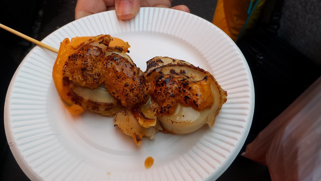 築地的美食...改天另一篇文章做更多的分享 ^^ 先看覺得最推薦的 炙燒海膽+干貝 串,真的好吃!