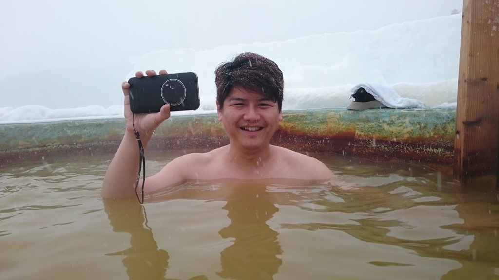 民眾(酒雄)不只無償擔任模特兒,還與熊一起完成台灣熊的第一次泡溫泉自拍(羞),另外也對ASUS ZenFone Zoom的表現與耐寒能力有相當好的印象!